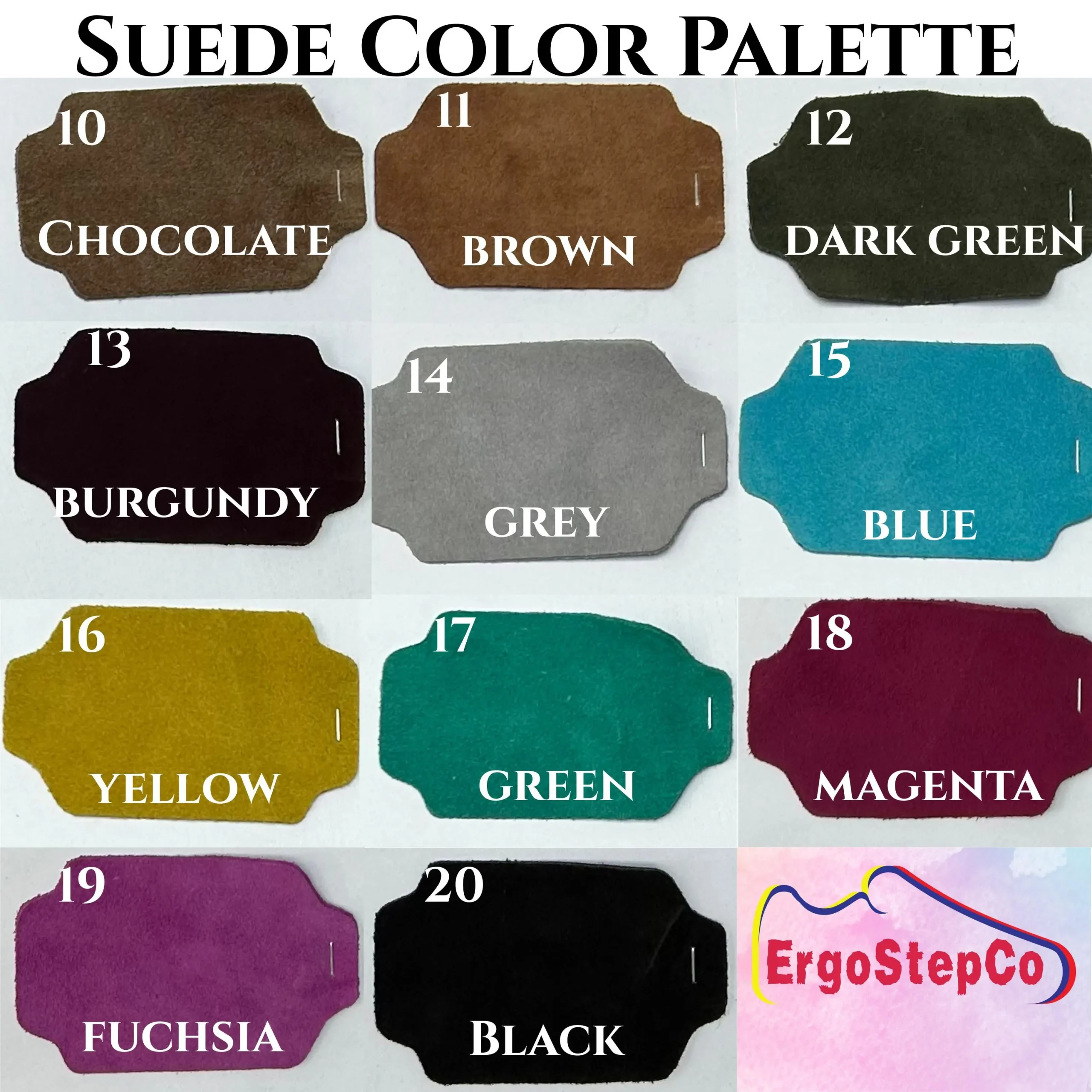 Choose your suede color (1–9 Leather / 10–20 Suede palette shown in the images).